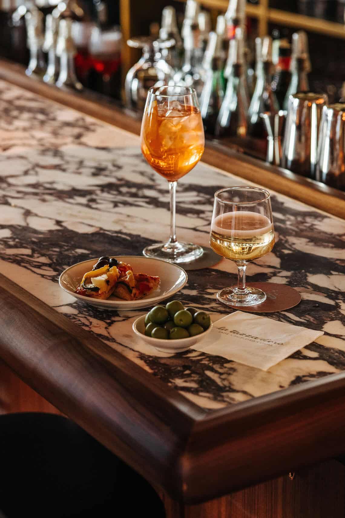 At the center of the experience is the bar, where La Tazza D’Oro’s Italian aperitivo program takes place each day. Aperitivo is treated as a social pause, a moment to slow down and gather. Guests settle in with classic Italian drinks such as Negronis, spritzes, prosecco, and wine, served alongside complimentary savory bites selected by the kitchen. Small slices of pizza, frittata, quiche, sandwiches, olives, and cheeses arrive throughout the hour, creating an easy rhythm as afternoon moves into evening.
